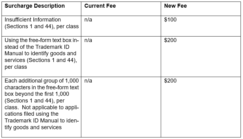 Applications filed with identifications of goods and services not included in the list will be subject to a $200 surcharge per class. Additionally, the USPTO is setting a new fee of $200 for each group of 1,000 characters (beyond the first 1,000 characters per class), including punctuation and spaces. The 1,000 character fee will not apply to applications filed using identifications of goods and services from the USPTO Trademark ID Manual and Master List.